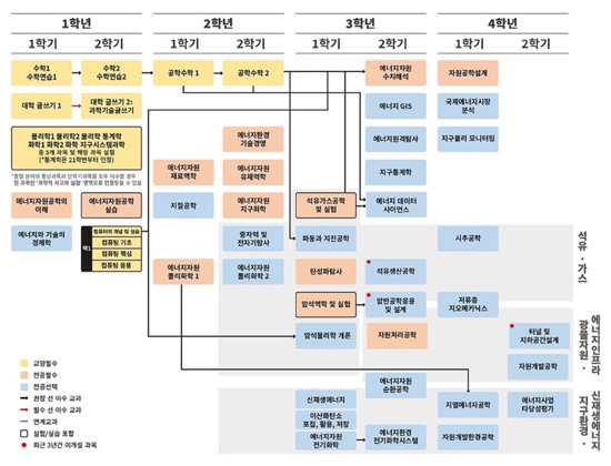 에너지자원공학과에서 제시하는 학과 전공 로드맵은 아래와 같습니다. 주황색으로 표시된 과목들은 에너지자원공학과 학생이라면 필수적으로 들어야 하는 전공 필수 과목들이고, 파란색으로 표시된 전공 선택 과목들은 각자의 관심 분야에 맞게 선택하여 수강할 수 있습니다.