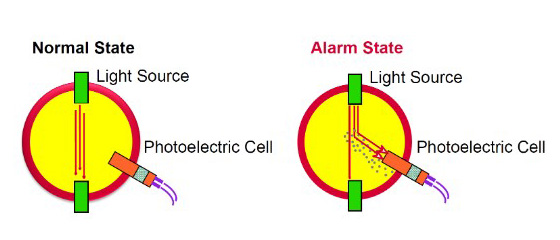광전식 화재경보기 안에는 발광소자와 광전소자3)가 있습니다. 발광소자와 광전소자는 서로 어긋나게 배치돼 있습니다. 그러면 발광소자에서 나오는 빛이 광전소자에 닿지 않겠죠? 하지만, 연기가 감지기로 들어오면 발광소자의 빛이 산란되며 광전소자에 빛이 도달하게 됩니다. 이렇게 평소와 다르게 빛을 감지하면 화재경보기에서 경보가 발생합니다.