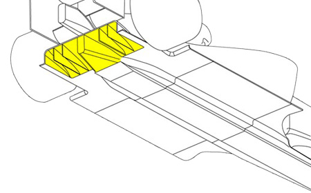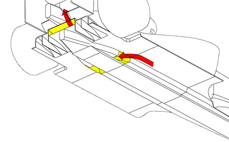'더블 데커 디퓨저'는 규정의 허점을 이용해 이 원리를 극대화했습니다. 브라운 GP 엔지니어들은 위 그림에서 노란색으로 표시된 부분처럼, 차량 바닥의 기준면과 그보다 약간 높은 계단면 사이에 있는 구멍을 활용했습니다. 이 구멍을 통해 공기가 디퓨저 상단에 위치한 두 번째 층(deck)으로 흘러 들어가도록 설계한 것입니다. 이 구조는 디퓨저의 외형적인 규제 높이를 지키면서도, 실질적으로 공기가 빠져나가는 면적을 훨씬 더 크게 확장하는 효과를 내었고, 막대한 다운포스를 생성할 수 있도록 했습니다.