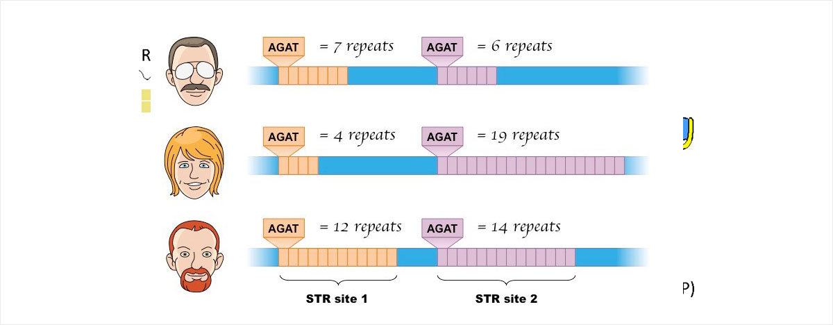 위에서 언급한 바와 같이 DNA 염기 서열 중에서도 마치 지문처럼 식별에 사용되는 특정한 DNA 부위가 따로 있습니다. 이는 바로 사람마다 다르고 고유한, 즉 그 사람을 대표할 수 있는 부위인 짧은 연쇄 반복(Short Tandem Repeat, 이하 STR) 부위입니다. STR 부위는 단백질 생성을 암호화하지 않는 DNA 염기서열입니다. 그저 무의미한 염기의 조합으로만 구성되어 있지만 이 조합 속에서 특정 염기가 반복되는 숫자가 사람마다 고유하다고 밝혀져 DNA ‘지문’으로 사용되기 시작하였습니다. 모든 DNA를 비교하기에는 시간과 비용이 많이 드는 반면 이러한 STR을 선정하여 그 부위만 비교하면 매우 효과적으로 DNA를 비교할 수 있다는 것을 학자들이 발견하여 주로 DNA 연구분야에서 사용하게 되었습니다.