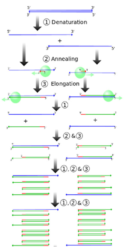 하지만 STR은 DNA의 특정 부위이기 때문에 DNA의 양이 충분치 않으면 조사에 활용할 정도의 유효성을 띄지 못합니다. 게다가 범죄 현장에서 발견되는 정액이나 침 등은 훼손되고 불완전한 경우가 많아 이를 채취한다고 하더라도 검사를 위해 얻을 수 있는 DNA의 양은 크게 부족합니다. 하지만 이 문제는 미국의 생화학자 캐리 멀리스가 실제 세포에서의 DNA 복제방식을 응용한 중합효소연쇄반응(Polymerase Chain Reaction, 이하 PCR)을 개발하면서 해결되었습니다. 이 기술에 대해 이해하려면 기본원리가 되었던 세포내에서의 DNA 복제방식에 대해 먼저 알아야 합니다.