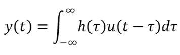 그런데 만약 엔진의 힘 u가 일정하지 않고 시간에 따라 달라진다면 어떻게 해야 할까요? 다양한 물리 시스템을 효과적으로 나타내기 위해서, 우리는 연속적인 입력을 첫 0.1초, 그 다음 0.1초, 또 그 다음 0.1초 등과 같이 매우 짧은 시간 동안 발생하는 힘(충격력)들의 합으로 표현합니다. “미소 구간에 대한 값들의 합”이라니, 혹시 눈치채셨나요? 네, 바로 적분이 사용됩니다. 정확히는 충격응답 h와 입력 u의 “합성곱”을 이용해 (3)과 같이 출력 y를 나타냅니다.