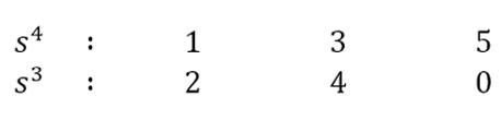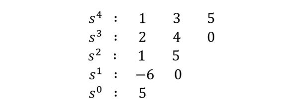 이것이 Routh 배열이고, 이를 이용해 주어진 다항식 a(s) 의 안정도를 판단할 수 있습니다. 각 항의 첫 번째 요소들의 값이 모두 양수이면, 시스템은 안정합니다. 그렇다면 위의 예시에 대해서는 어떻게 판단할 수 있을까요? s1 의 첫 번째 요소가 음수(-6)이기 때문에, 안정하지 않다는 것을 쉽게 확인할 수 있습니다.