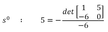 이제 규칙에 따라 행 s2, s1, s0을 채워야 합니다. s3의 첫 번째 항이 2라는 것을 확인하셨나요? 2는 분모로 두고, 분자에는 s4와 s3의 값들로 이루어진 행렬식9 을 두고 계산하면 (6)과 같이 s2를 구할 수 있습니다.