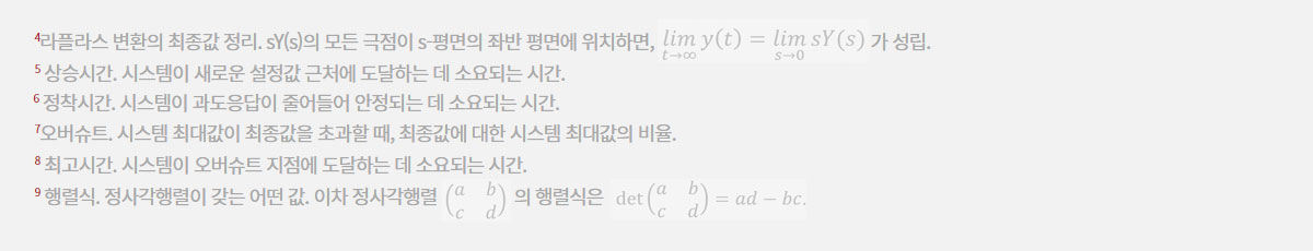 두 번째로, 비행체 제어원리 교과목에서는 시스템의 안정도와 해의 수렴 과정을 분석하는 방법을 배웁니다. 과목 특성상 특정한 값에 수렴하는 문제를 다루는 경우가 많기 때문에, 해의 수렴 여부 또한 중요하게 다뤄집니다. 구체적으로는 해의 수렴 값을 계산하기 위한 라플라스 변환의 최종값 정리4 , 수렴의 특성을 나타내는 상승시간5 ·정착시간6 ·오버슈트7 ·최고시간8 등의 지표들, 그리고 시스템의 안정도를 파악하는 방법 등을 알아갑니다. 간단한 예시와 함께, Routh 배열을 이용하여 다항식의 안정도를 함께 파악해 볼까요?