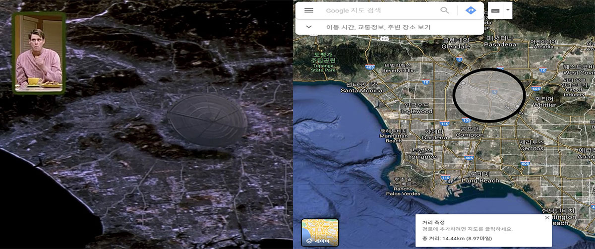 그림 3. 지도를 이용한 돔의 크기 추측 (피터 위어, 영화 ‘트루먼 쇼’ 中 / Google Maps)
