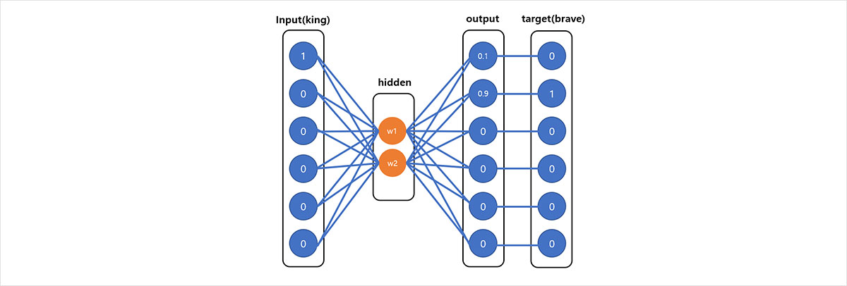 그럼 앞선 예시로 돌아가 ‘king’이라는 단어를 워드투벡터를 통해 이차원 벡터로 임베딩 해보겠습니다. 우선 원-핫 코딩을 통해 ‘king’에 원-핫 벡터를 부여하면 [1,0,0,0,0,0]이 됩니다. 다음으로 은닉층에 벡터는 일단 무작위적으로 부여됩니다. 예를 들면, 처음에 은닉층에 임의의 벡터가 부여되어 그림4와 같이 출력층에 [0.1,0.9,0,0,0,0]가 출력되었다고 합시다. 그러면 ‘king’의 주변 단어였던 ‘brave’의 원-핫 벡터와 출력된 벡터를 비교하여 차이를 계산할 수 있고, 계산된 차이에 따라 은닉층에 부여된 벡터를 조정하게 됩니다. 이러한 과정을 인공신경망의 역전파(backpropagation)라 부르며, 역전파 과정을 반복하여 중심단어와 주변단어의 차이가 최소화되는 방향으로 점차 은닉층의 벡터가 조정되는 것입니다.