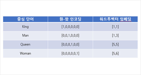 다시 처음의 질문으로 돌아가 “나는 배가 고파서 밥을 _______.” 라는 문장의 빈칸에 ‘먹는다’라는 단어가 들어가면 적절한 이유는 문맥상 그렇기 때문입니다. “밥”이라는 대상에 작용할 수 있는 가장 타당한 행위는 먹는 것이고 그렇기에 빈칸에 들어가야 할 단어는 “먹는다” 인 것입니다. 하지만 원-핫 인코딩은 단어들 간의 유사도를 전혀 반영하지 못하기에 이러한 문맥상 해석이 불가능합니다. 그렇기에 컴퓨터가 언어를 이해했다고 볼 수 없는 것이지요. 더불어 일상적인 언어에 쓰이는 단어는 몇천 개에 이르는데 원-핫 인코딩 방법으로 이들 단어 각각에 벡터를 부여한다면 입력 데이터의 차원이 지나치게 높아진다는 단점도 있습니다.