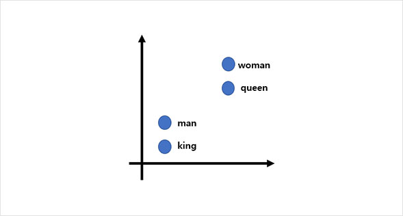 워드투벡터 과정을 거치면 최종적으로 [그림5]와 같이 단어를 이차원의 벡터로 임베딩 할 수 있습니다. 이 벡터를 [그림6]과 같은 이차원 그래프로 시각화하면 단어들의 유사도를 인지할 수 있습니다. 그림에서 확인할 수 있듯이 “man”과 “king”이 그리고 “woman”과 “queen”이 비슷한 곳에 위치해 있는 것을 볼 수 있고 이는 두 단어 사이에 유사도가 있다는 것을 의미합니다. 워드투벡터 과정을 통해 언어를 임베딩하여 컴퓨터에 입력하면 비로소 컴퓨터가 단어와 단어 사이의 관계, 즉 문맥을 이해할 수 있게 되는 것입니다.