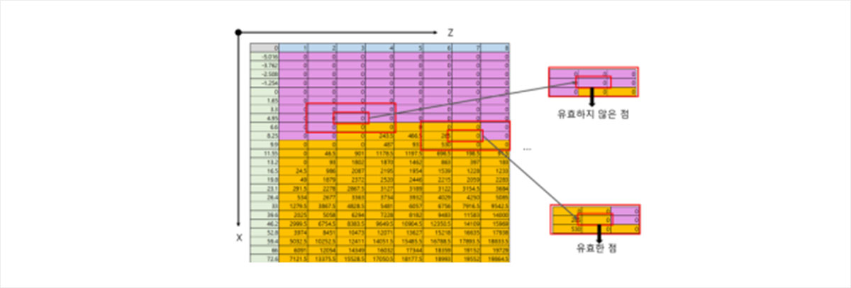 선박 외형 설계는 선박의 정보를 불러와 외형을 파악하는 것으로 시작됩니다. 선박은 크기가 매우 크고, 각 부분마다 상이한 모양의 복잡한 3차원 형상으로 되어 있어 설계도에 모든 정보를 한 번에 표현하기 어렵습니다. 우리가 보는 그대로의 3차원 형상을 설계도에 옮기게 되면 오히려 정보가 왜곡될 수 있지요. 그렇기에 중심선으로부터 배의 겉면까지의 거리와 높이를 정확하게 숫자로 기입한 표, 오프셋 테이블(Offset Table)을 설계도처럼 사용하는데요. 오프셋 테이블을 이용하려면 먼저 유효하지 않은 값을 제거해주어야 합니다. 0의 값을 갖는 데이터들은 유효하지 않기 때문에 그림 1과 같이 유효한 값만 남겨줍니다. 그리고 표 형태의 배열은 원하는 정보를 한 번에 검색하기 어렵기 때문에 정보의 접근성을 높이기 위해 형태를 변경합니다.