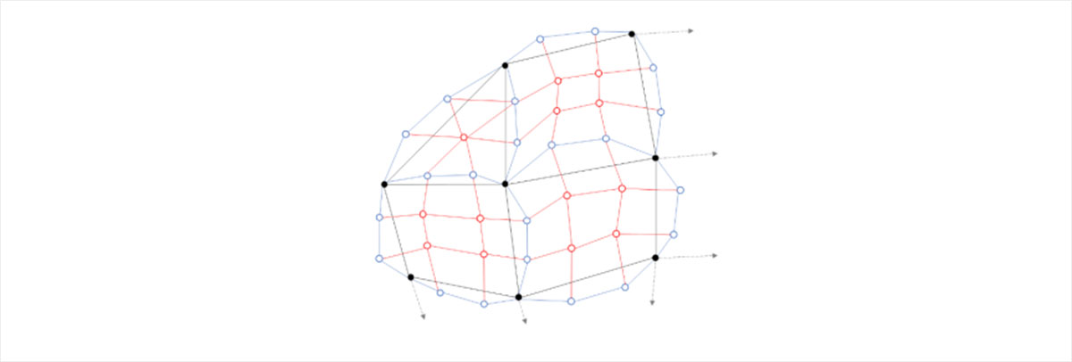 유효한 점들을 이어 그림 2와 같이 점과 선으로 이루어진 topology structure2로 변환합니다. 이렇게 단순한 기하학 형태로 변환하면 해당 점이 곡면의 경계를 이루는지, 아니면 곡면 내부의 점인지를 한눈에 파악할 수 있게 됩니다.