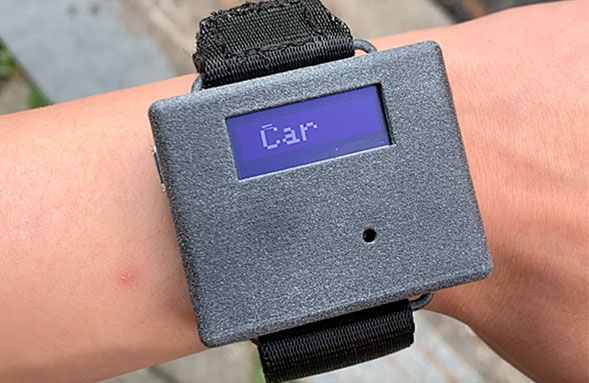 이렇게 수집한 데이터를 이용해 제작한 딥러닝 모델을 마이크로 컨트롤러의 종류 중 하나인 아두이노에 업로드했습니다. 여기서 마이크로 컨트롤러란 조그만 컴퓨터라고 생각하시면 됩니다. 그리고 아두이노를 소형 진동모터와 OLED 디스플레이와 연결하고, 3D 프린팅을 한 케이스에 넣어 제품을 완성했습니다.
