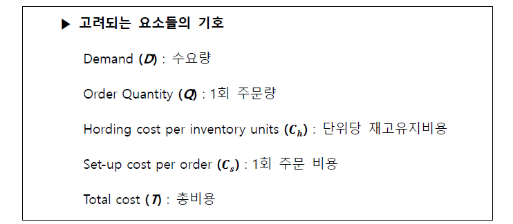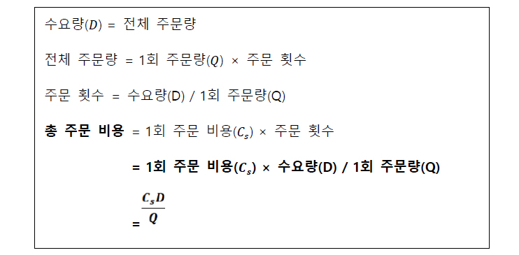 우리는 이 총비용을 최소화하기 위한 주문량을 최적의 주문량(경제적 주문량)이라고 하며 이것을 구하기 위해 총 주문 비용과 재고유지비용의 식들을 세워 총비용의 최소값을 구할 것입니다.