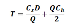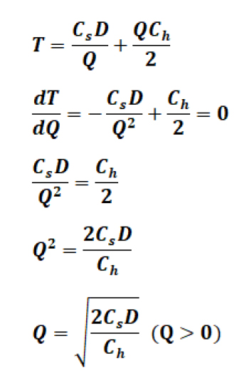 이러한 제한된 모델에서는 수요를 정확하게 알 수 있고 재고 부족 비용2은 고려하지 않으므로 재고와 관련된 총비용은 총 주문 비용과 재고유지비용으로 한정시킬 수 있습니다. 따라서 다음과 같은 식이 성립합니다.