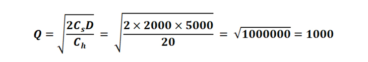 그럼 마지막으로 다시 빵집 사장의 입장으로 돌아가서, 최적의 결정을 내려볼까요? 이번 달 크림빵의 수요는 5,000개이며, 단위당 재고유지비용은 20원, 1회 주문 비용은 2,000원이라고 가정할 때 최적의 1회 주문량을 구해봅시다.