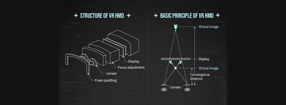 VR 게임방이나 체험관에 가 보셨거나, VR 기기에 관심이 있다면, 머리에 고정해 고글처럼 착용하는 VR 기기를 본 적 있으실 텐데요. 이러한 디스플레이를 ‘두부 장착형 디스플레이(Head-mounted Display)’, 즉 HMD라 한답니다. 확장현실에서는 HMD와 같은 기기를 통해 사용자의 시야를 묘사하여 가상현실 혹은 증강현실을 구현합니다. 그렇다면 HMD의 원리는 무엇일까요?