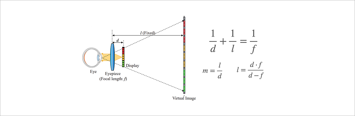 확장현실을 구현하기 위해, HMD는 그림 5와 같이 눈과 디스플레이 사이에 있는 렌즈를 통해 사용자가 디스플레이의 영상을 편안히 볼 수 있는 위치에 가상의 영상을 만듭니다. 이 원리를 이해하기 위해서는 얇은 렌즈에 대한 렌즈 방정식을 이해해야 합니다. 그림 6은 HMD에서 가상의 상이 맺히는 모식도와 렌즈 방정식을 나타내는데요, 렌즈와 디스플레이 사이의 거리 d보다 살짝 큰 초점거리 f를 가지는 렌즈를 이용하여, 디스플레이와 같은 방향으로 l만큼 떨어진 곳에 m배만큼 확대된 상을 만들 수 있습니다.