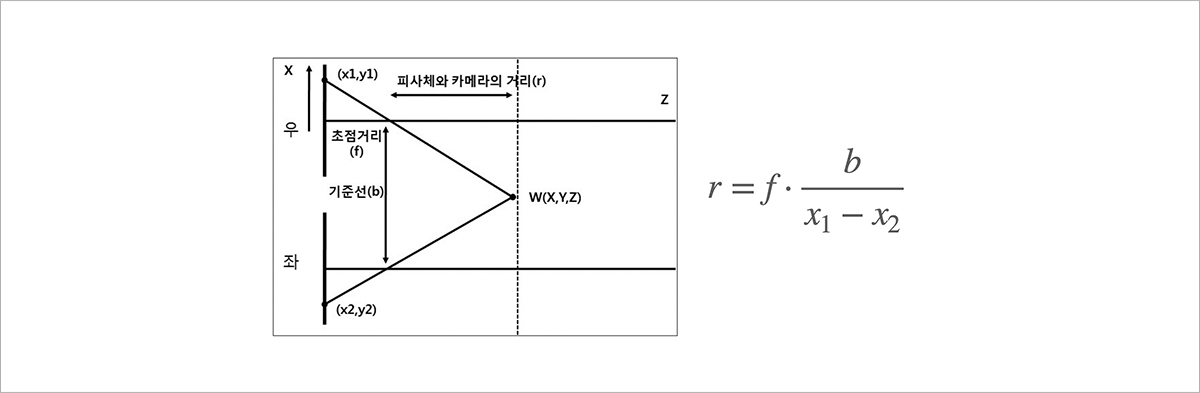 그림 7. 스테레오 방식 뎁스카메라의 원리(출처 : 염지운, and 최광순. "AR/VR HMD 에서의 입체 표현 기술 최근 연구 동향." 한국통신학회지 (정보와통신) 36.10 (2019): 3-9.)