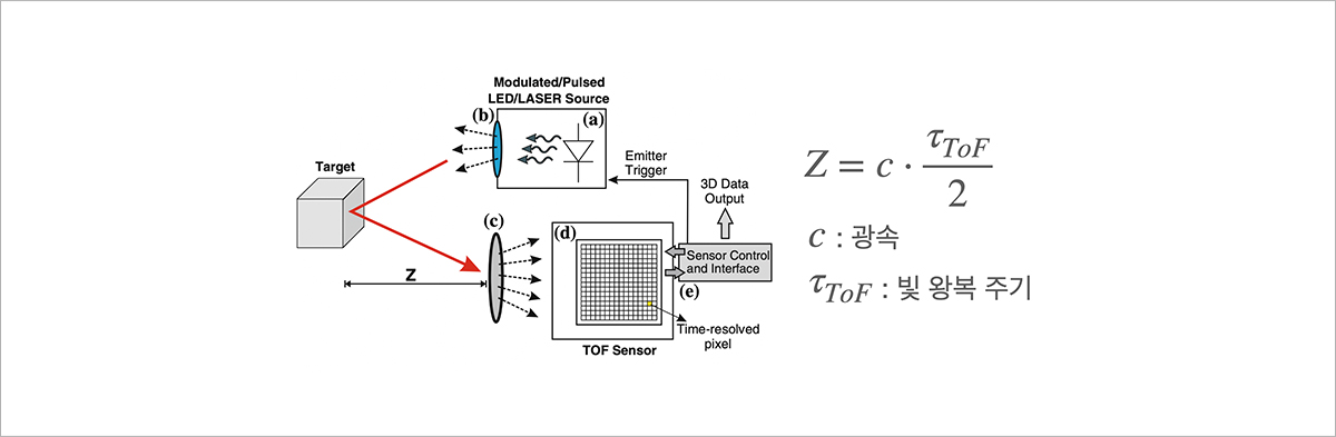 그림 8. ToF(Time of Flight) 방식의 뎁스카메라 원리(출처 : Remondino, Fabio, and David Stoppa, eds. TOF range-imaging cameras. Vol. 68121. Heidelberg, Germany: Springer, 2013.)