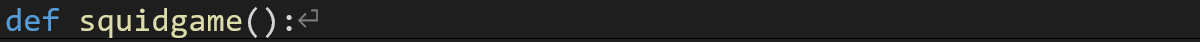 우리의 목표가 될 메인 함수를 '오징어 게임'의 제목을 따서 이 함수를 squidgame이라고 이름지어 볼까요? 참고로 함수의 이름은 younghee, mugunghwa 등 어느 것으로 해도 상관없습니다. 함수 선언에는 def 명령어를 이용합니다.