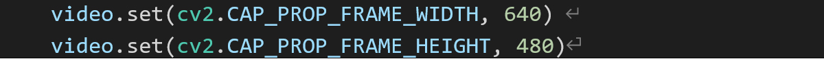 다음으로 카메라를 통해 받는 데이터의 크기를 우리가 정한 크기만큼 사용하기 위해 너비와 높이를 지정해 주어야 하는데, 이때는 video 변수에 set 메서드를 불러와 사용합니다.3 데이터의 크기를 정하지 않을 경우 에러가 발생할 수도 있기 때문에 잊지 말고 지정해 주세요.