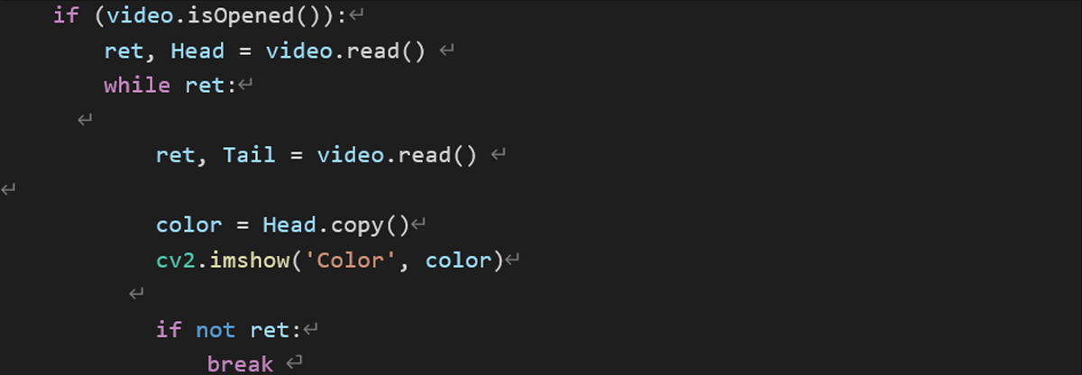 이를 파이썬 코드로 구현하는 과정은 다음과 같습니다. 우선 조건문 if를 활용해서 영상 정보가 들어오는 경우에만 코드를 실행하도록 합니다. isOpened 메서드를 활용해 영상을 정상적으로 입력 받았다는 사실을 확인했다면, 이어지는 코드를 실행해 read 메서드를 활용해 Head 변수에 첫번째 프레임의 정보를 받아 오고, 아니라면 break 명령어로 프로그램을 멈추어 줍니다.
