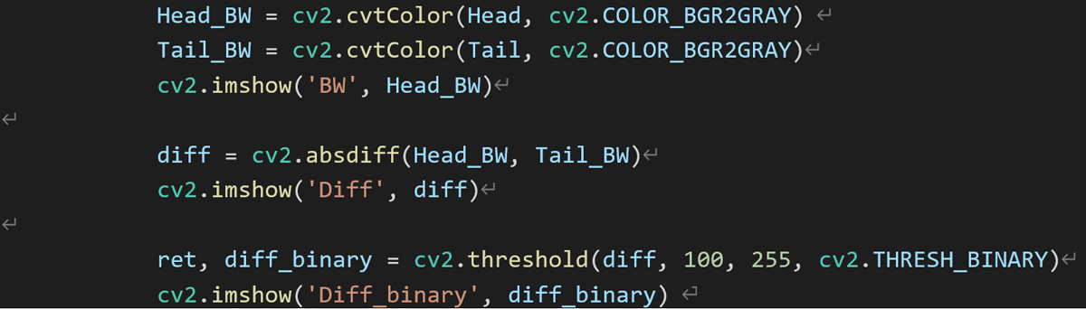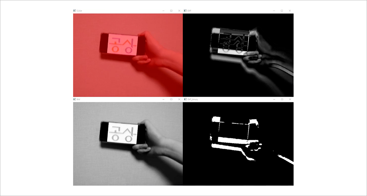 이제 두 프레임 간의 차이를 비교하는 과정이 남았습니다. 그런데 여기서 잠깐! 우리가 Head와 Tail로 받아들인 정보는 컬러 영상 이미지입니다. 디지털 환경에서 컬러 이미지는 이미지를 구성하는 각 픽셀의 컬러 정보를 BRG(Blue, Red, Green), 즉 파랑, 빨강, 초록의 삼원색으로 나누어 그 세기를 0부터 255까지의 값으로 저장하는데요. 이때 삼원색의 세기 값을 각각 모두 비교하다 보면 프로그램의 계산량이 너무 많아지는 문제가 있습니다. 이를 방지하기 위해 흑백으로 영상을 전환해 주는 OpenCV 라이브러리의 메서드, cvtColor를 이용해 Head와 Tail변수에서 BRG 세 요소로 표현된 값을 흑백(Grayscale), 즉 0부터 255까지의 단일한 밝기 값으로 바꾸어 주어야 합니다.