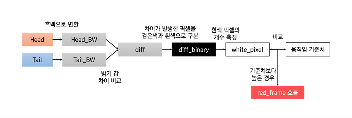 영상 정보를 입력 받는다는 것은 '프레임'이라는 정지한 시각 정보가 연속적으로 들어온다는 것을 의미합니다. 그러니 만약 연속한 두 프레임의 시각 정보가 서로 다르면 '움직임'이 발생했다고 볼 수 있겠죠. 다시 말해 우리는 앞 프레임과 뒤 프레임의 시각 정보를 서로 비교해야 한다는 것입니다. 앞 프레임을 Head, 뒤 프레임을 Tail이라는 이름의 변수로 각각 지정해 비교하면 되겠죠? 첫번째와 두번째 프레임을 비교한 다음엔, 두번째 프레임을 Head로 바꾸고 다시 세번째 프레임을 Tail로 바꾸어 비교합니다. 두번째, 세번째를 비교하고 나면 세번째와 네번째 프레임을 비교하고… 이런 식으로 계속해서 반복해 비교하면 되겠네요.