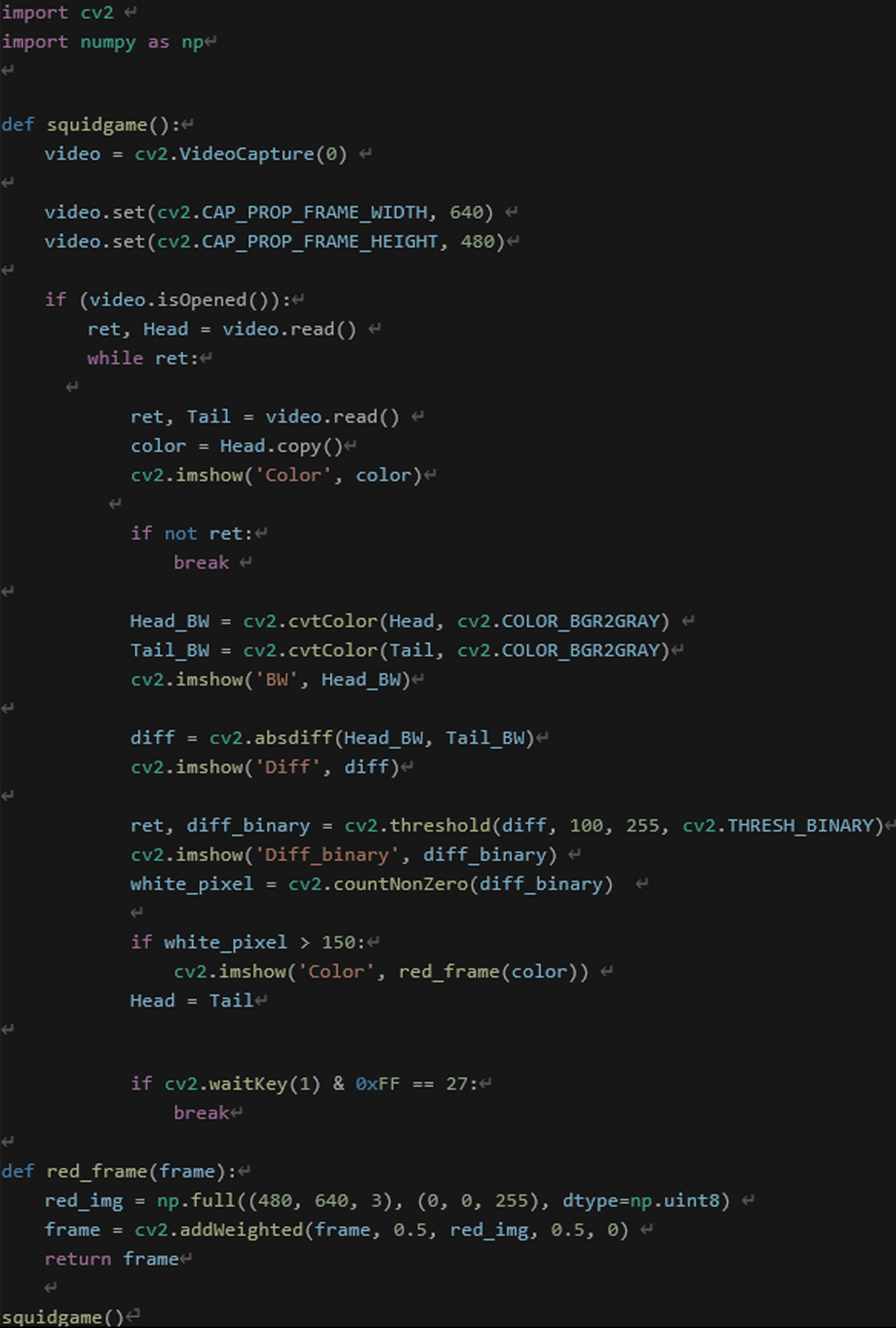 마지막으로 조건문 if를 활용해서 움직임이 감지된 순간, 즉 white_pixel의 값이 기준치 150을 넘긴 순간 red_frame 함수가 실행되도록 하면, 짜잔! '오징어 게임'의 '무궁화 꽃이 피었습니다' 게임이 만들어집니다. 마지막에 squidgame 함수를 호출해 주면 게임이 정상적으로 실행되는지 확인할 수 있습니다.