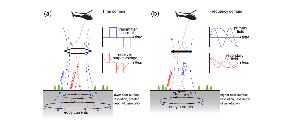 전자 탐사는 현재 가장 다양하게 장비가 개발되어 각종 지구물리탐사 문제에 광범위하게 적용되고 있는 방법으로서 크게 주파수(진동수) 영역 전자 탐사법(frequency-domain Electroㅡagnetic survey; FEM)과 시간 영역 전자 탐사법(time-domain Electromagnetic survey; TEM)으로 구분됩니다. FEM에서는 하나 혹은 여러 개의 전자기장 송신원(source)를 이용하여 전자기장의 위상 이동을 측정하고, TEM에서는 시간의 경과에 따른 전자기장의 진폭을 측정한다는 차이가 있습니다. 근본적인 원리는 아래의 그림과 같습니다.