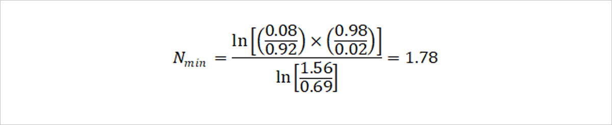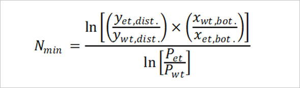 Fenske equation을 원소주 생산에 적용해볼까요? 원소주의 도수는 22도로, 이는 전체 혼합물 중 에탄올의 부피가 0.22만큼 들어있다는 뜻입니다. 즉 원소주 한 병의 용량 375mL 중 에탄올은 82.5mL, 물은 292.5mL만큼 혼합되어 있는 것이지요. 두 물질의 부피에 에탄올의 밀도 0.789g/mL와 물의 밀도 0.997g/mL를 곱하면 한 병에 들어있는 에탄올과 물의 질량 65.1g, 292g을 각각 구해낼 수 있습니다. 한편 물의 분자 질량이 18.01g/mol정도이고, 에탄올의 분자 질량이 46.07g/mol이므로, 원소주 속 에탄올과 물의 몰분율은 다음과 같이 계산됩니다.