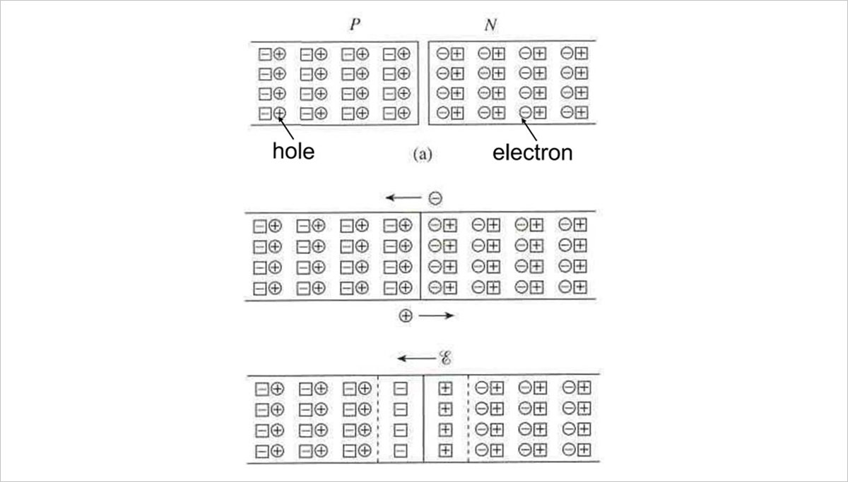 앞에서 이야기한 P형 반도체와 N형 반도체를 접촉시키면 어떤 일이 벌어질까요? P형 반도체에는 정공이, N형 반도체에는 전자가 많기 때문에 농도 차이에 의한 확산5이 일어납니다. 정공은 P형에서 N형으로, 전자는 N형에서 P형으로 확산되는 것이죠. 이때 정공과 전자가 반대편으로 넘어가고 나면, 그 자리에는 이온화된 불순물들이 남게 됩니다. 이렇게 형성된 영역을 ‘공핍 영역’이라고 하는데요. 공핍 영역에 남게 된 양이온과 음이온 사이에는 전기장이 형성되면서 정공과 전자의 확산이 더 이상 일어나지 않도록 막아주어 평형 상태에 이르게 됩니다.