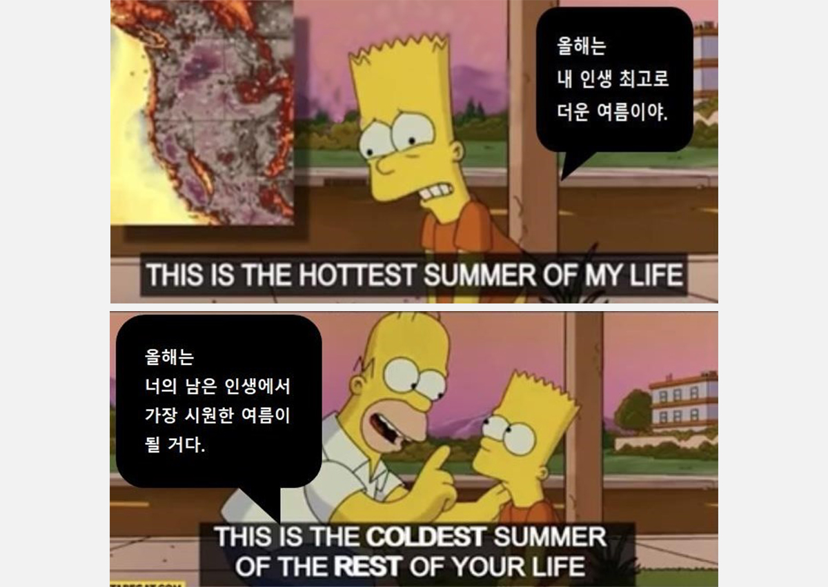 정말 찜통 같은 무더위가 계속되고 있는 요즘 날씨입니다. 무더운 날씨 속에서 지구온난화와 기후위기가 매우 심각한 문제라는 것을 온몸으로 느낄 수 있는데요, 미국의 인기 애니메이션 <심슨 가족>에서는 이러한 기후위기를 패러디한 장면이 나오기도 했습니다.