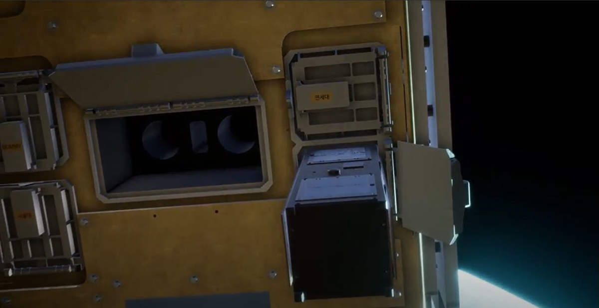 그림 3. 덮개가 열리면서 큐브위성이 성능검증위성으로부터 사출되는 모습. 덮개마다 위성을 제작한 제작한 학교의 이름이 적힌 것을 볼 수 있음.