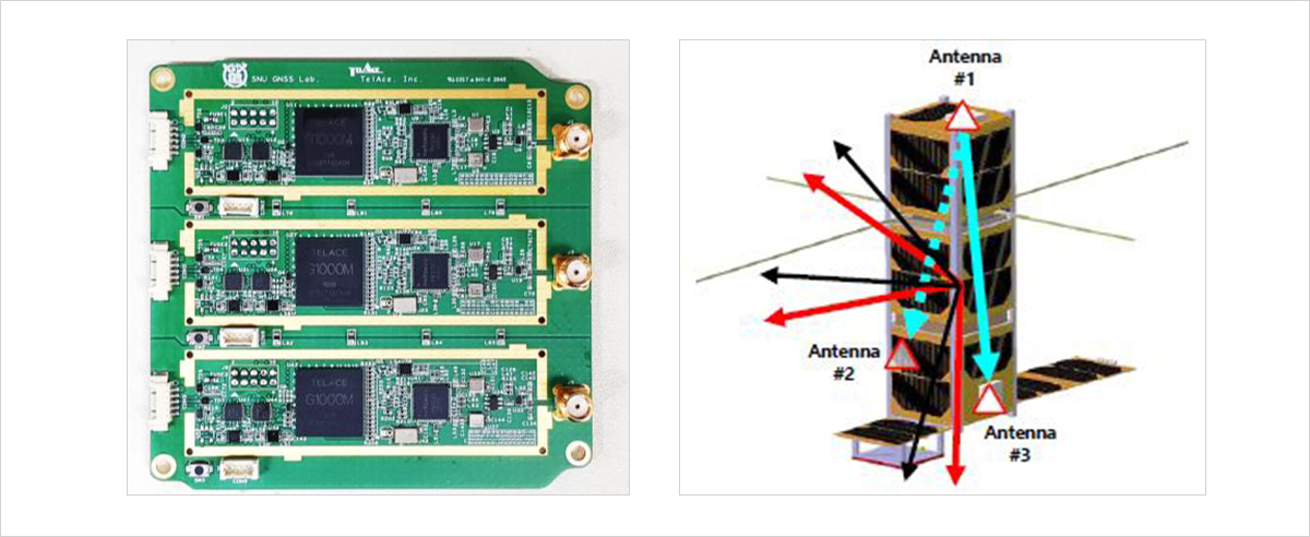 첫 번째 핵심 부품은 초정밀 mm급 GPS 수신기입니다. 기존 m급 우주용 GPS 수신기는 외국 부품에 의존했는데, 전략물자2 로 분류되면서 국내 도입이 매우 어려웠다고 해요. SNUGLITE 팀에서는 국내 중소기업과 협력하여 mm급의 정밀도를 보이면서 상용 GPS 수신기 전력의 1/3 수준으로도 작동하는 수신기를 직접 개발했습니다.