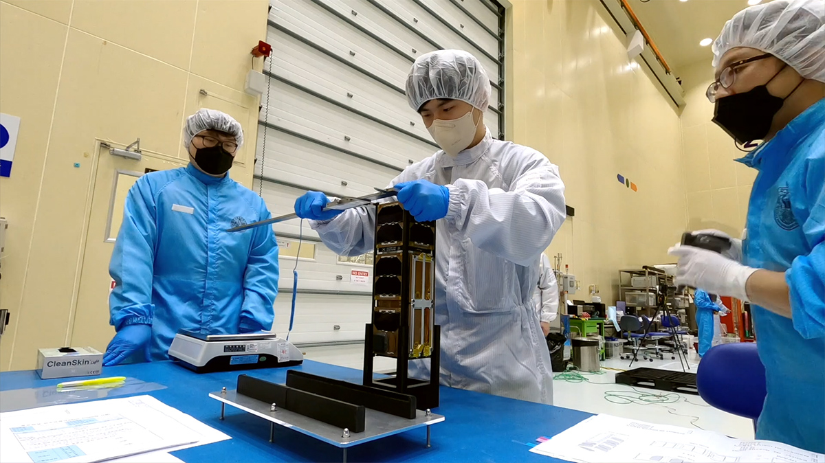 그림 7. 성능검증위성 탑재 전 검수작업을 하는 배영환(왼쪽) ∙ 심한준(가운데) 박사과정
