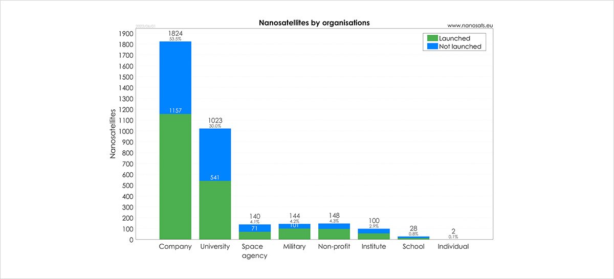 - [2] Nanosatellites by organisations . (2022). Retrieved from https://www.nanosats.eu/img/fig/ Nanosats_organisations_2022-06-01_large.png.