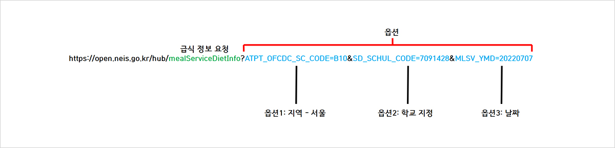 예시 링크에 접속하면, 한 학교의 7월 7일 급식 정보가 나타날 것입니다. 이는 링크에 학교와 날짜를 지정해주었기 때문입니다. 위 링크처럼 원하는 학교의 지역과 학교 코드를 검색해서, 항목 1과 항목 2 자리에 넣고, 날짜를 지정해서 동일한 형식의 링크를 만들어 접속하면 원하는 학교의 급식 정보를 자유자재로 얻어올 수 있습니다.