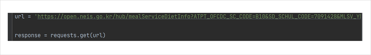 이제 코딩을 위한 준비는 다 끝났습니다. 이제 저희가 사용할 데이터에 대해 알아보겠습니다. NEIS에서는 전국 초, 중, 고등학교의 급식 식단 정보를 저장 및 업데이트하고 있고, 이를 누구나 쉽게 사용할 수 있도록 API3 의 형태로 제공하고 있습니다. NEIS의 경우에는 주소창에 특정 옵션들을 입력함으로써 데이터를 얻어올 수 있게 하는 기능을 제공합니다.