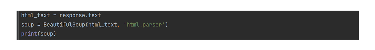 여기에서, BeautifulSoup 함수에 들어간 두 번째 입력은 어떤 방식으로 읽어올지를 정하는 것입니다. ‘html.parser’을 대입하면 우리가 웹에서 주로 사용하는 형식으로 읽어오는 것이라고 생각하면 됩니다.