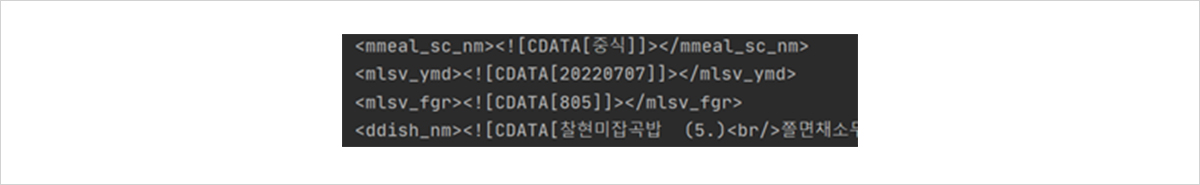 <mmeal_sc_nm> 이라는 태그부터 살펴보겠습니다. 우선 CDATA는 “Character DATA”의 약자로서, XML 문서 형식으로 파싱하지 않아도 되는 평문이라는 의미입니다. 우리가 원하는 데이터는 저 안에 있을 가능성이 높습니다. 실제로 “중식”이라는 데이터가 포함되어 있군요!