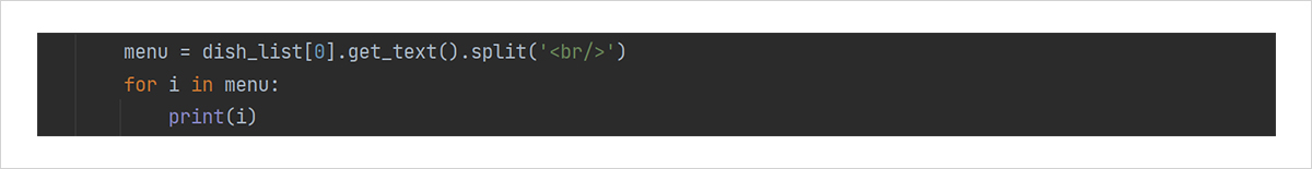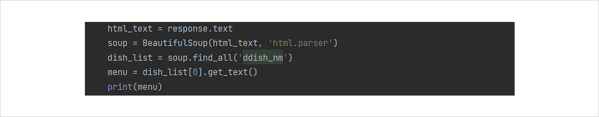 BeautifulSoup의 find_all 함수를 활용하여, 아까 우리가 출력한 결과물 soup에서 특정 태그 내부의 내용만을 파싱할 수 있습니다. 이를 dish_list에 저장하겠습니다. 이제 리스트 중 첫 번째 급식의 내용을 가져온다는 의미로 dish_list.get_text() 함수를 이용해 메뉴를 완전히 가져와서 출력해 보겠습니다. 현재까지의 내용을 코딩하고, 결과물을 아까와 마찬가지로 확인하면,
