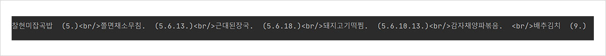따라서 mmeal_sc_nm이라는 태그 내부에는 아침, 점심, 저녁 중 어느 때인지가 나타나 있다는 것을 알 수 있습니다. 마찬가지로 몇몇 태그를 읽어 보겠습니다.
