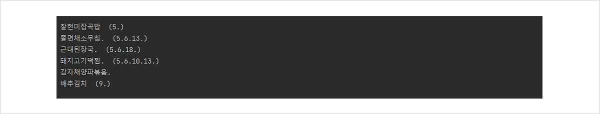 생각할 수 있는 가장 단순한 방법은 전체 결과물을 반복문을 통해 돌아보다가, 급식메뉴와 관련된 내용이 나타나면 멈추고 그 부분만 출력하는 것입니다. 예를 들면 '쫄면', '김밥'과 같은 메뉴 이름을 미리 저장해 두었다가 일치하는 문자가 나타나면 출력하는 것이지요. 그러나 우리가 모든 급식의 종류를 미리 써놓을 수 없기 때문에 이 방법을 사용하는 것에 한계가 있습니다. 그럼 더 정확한 방법을 사용해 볼까요?