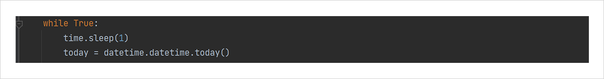 무한히 반복되는 코드는 while문을 사용해서 코딩하면 간편합니다. while문은 조건문이 참인 동안 동작하므로, while True: 반복문 내부에 있는 명령은 무한히 반복됩니다. 이제 time.sleep(1) 함수를 이용해 1초 간격으로 동작하게 하여, datetime.datetime.today()를 이용해 현재 시간을 불러와 9시가 넘었는지를 확인합니다.