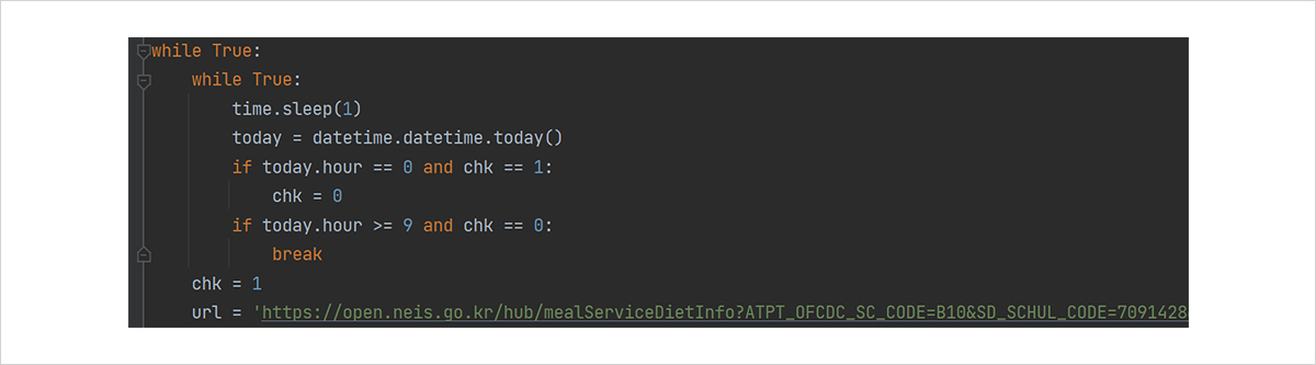 그림 17의 코드를 해석해봅시다. 프로그램을 처음 실행하면 chk에 저장된 값은 0입니다. 만약 chk가 0인 상태에서 시간이 9시를 넘었다면 급식 메뉴를 출력하고 chk를 1로 바꿉니다. 이제는 시간이 9시가 넘어도, chk가 1이기 때문에 크롤링을 진행하지 않게 됩니다. 코드는 이곳(https://colorscripter.com/s/DrRNGVz)에 있습니다.