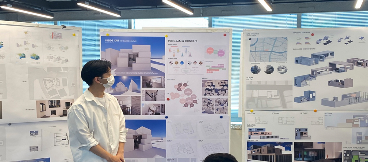 이 모든 설계 과정을 정리한 포스터(판넬)를 만들어서 교수님들께 최종 발표를 하고, 최종 평가를 받는 것으로 하나의 프로젝트가 마무리됩니다. 주로 건축학과 건물 복도에서 큰 판넬들을 쭉 전시해 놓고, 다른 친구들과 함께 서로의 작품을 감상하면서 교수님들의 평가를 들을 수 있습니다. 이 과정에서 다른 친구들의 작품을 보고 미처 생각하지 못한 부분에서 새로운 영감을 떠올리게 되는 등 많은 자극을 받을 수 있습니다.