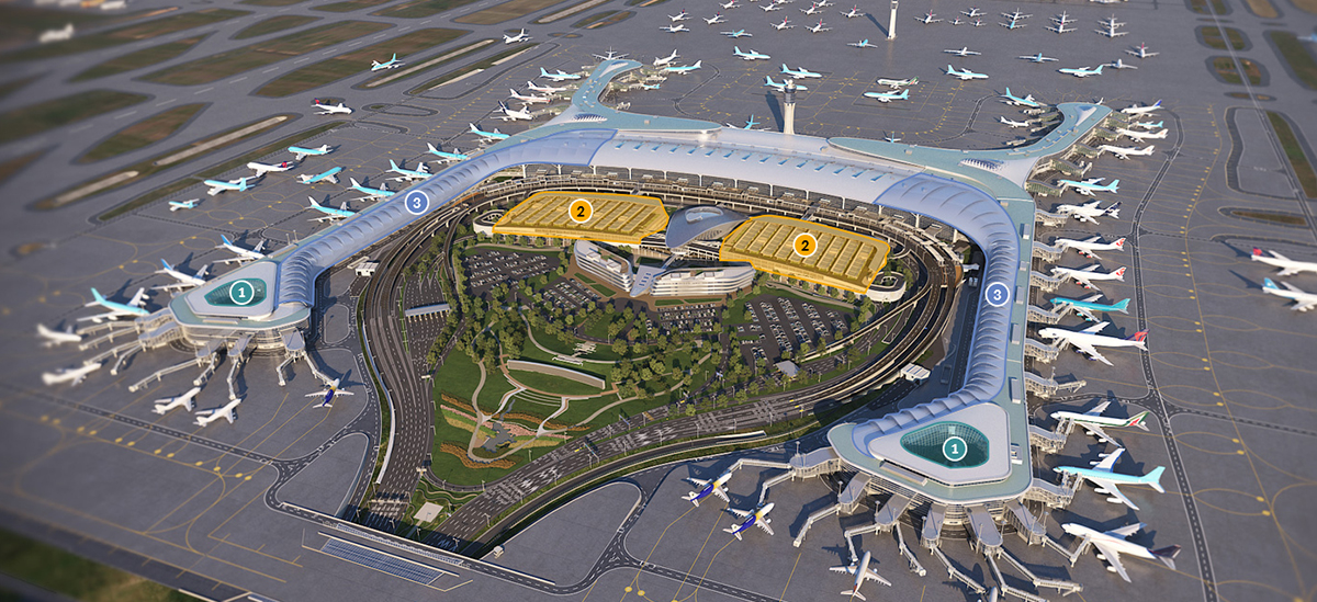 - A. 방금 말씀해주셨던 것처럼 인천국제공항공사에서는 네 번째 건설사업을 진행하고 있습니다.1 건설사업들을 간략하게 소개하자면, 인천공항 1단계 건설사업은 여러분들이 잘 알고 있는 제1여객터미널 건설사업이고, 2단계 건설사업은 지하 셔틀 트레인을 타고 갈 수 있는 탑승동 건설 사업이에요. 3단계 건설사업은 제2여객터미널 절반을 건설하는 사업이었고, 이번 4단계 건설사업은 제2여객터미널의 나머지 절반과 네 번째 활주로를 건설하는 사업입니다.
