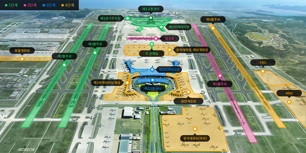 - Q. 이번에 진행하시는 제2여객터미널 확장 골조 및 마감공사도 인천공항 4단계 건설사업의 핵심 과업 중 하나라고 알고 있는데, 인천국제공항공사의 단계별 건설사업에 대해 소개해주세요.