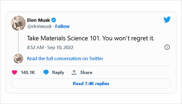 “Take Materials Science 101. You won’t regret it.(재료 과학 개론 수업을 들으세요. 후회하지 않을 거예요.)” 지난 9월, 테슬라의 CEO이자 억만장자인 일론 머스크가 자신의 트위터에 남긴 글입니다. 다가올 미래에 재료 과학이 중요한 역할을 하게 될 것이라는 일론 머스크의 견해를 암시하고 있는데요. 그 덕분에 재료 과학, 재료공학 분야가 많은 사람들의 관심을 받게 되었습니다.